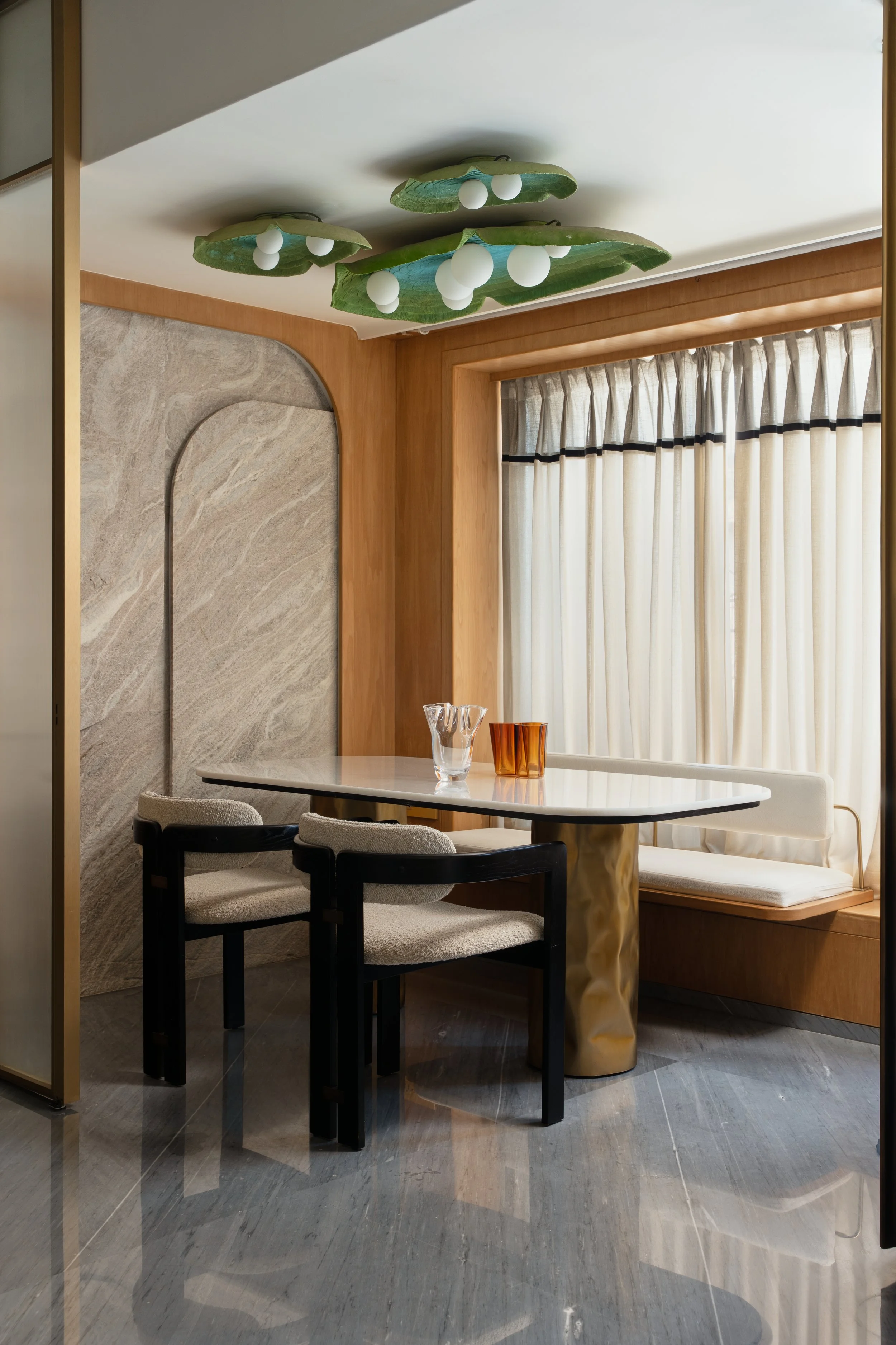 The apartment has a sense of subtle luxury and was designed with an appreciation for minimalism. Pops of bold color that draw attention to the area give a minimalist backdrop warmth and individuality. From Bombay design lab Furniture to accent walls adorned with wallpaper from Elegant Décor and Metallic Paint by Colour Coats, Texture paint from Kemtex, Pu and rest of the paint from Asian paints, Veneer from Tabu and Venzo, Lights from Arjun Rathi and Shailesh Rajput, Totem from Harshita Jhamtani, Dinning table legs from White domus, Dining Table chairs from Defurn, Side table from Hatsu, Sofa Fabric from Perinials, Curtains from Purple patch and cutieboo, Beddings and pillow covers from Yamini, Painting and artwork from Tarque and décor pieces from Lladro and Nivasa each element is carefully curated to create a sense of Playfulness and Warmth to the interiors without overwhelming the senses.